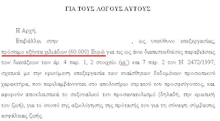 Η Αρχή Προστασίας Δεδομένων Προσωπικού Χαρακτήρα με την υπ' αριθμ. 3/2008 απόφασή της επέβαλε πρόστιμο 60.000 ευρώ σε ασφαλιστική εταιρεία, επειδή παράνομα επεξεργάστηκε ευαίσθητα δεδομένα προσωπικού χαρακτήρα που περιλαμβάνονται στο απολυτήριο στρατού πολίτη και αφορούσαν αποκλειστικά το σεξουαλικό του προσανατολισμό, προκειμένου να αξιολογήσει την αίτηση του πολίτη για σύναψη σύμβασης ασφάλειας ζωής.